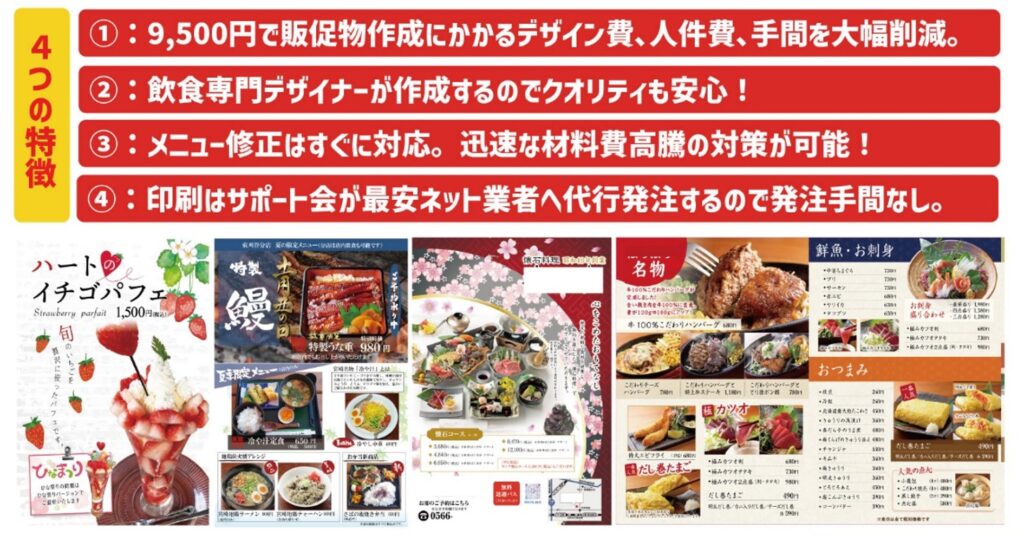 当サポートクラブでは販促物(メニュー、チラシ、店内POPなど)のデザインが無制限で頼み放題。