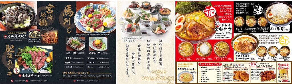 販促物例・・・チラシ/メニュー表/ポスター/看板/割引券/店案内パンフレット/名刺/商品シール/SNS用画像/ など